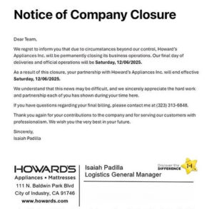 howards_closing-employee_notice-ADJ-RS December 10, 2025 by Ted Leave a Comment Share this post:Tweet Click to share on Reddit (Opens in new window) Reddit More Click to email a link to a friend (Opens in new window) Email Click to print (Opens in new window) Print Like this:Like Loading...