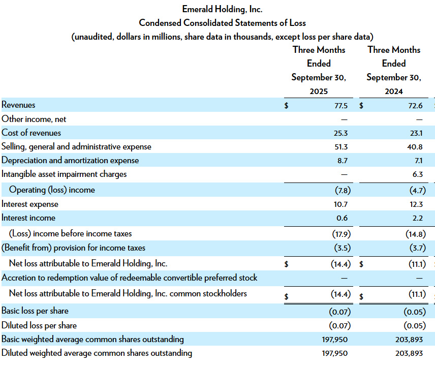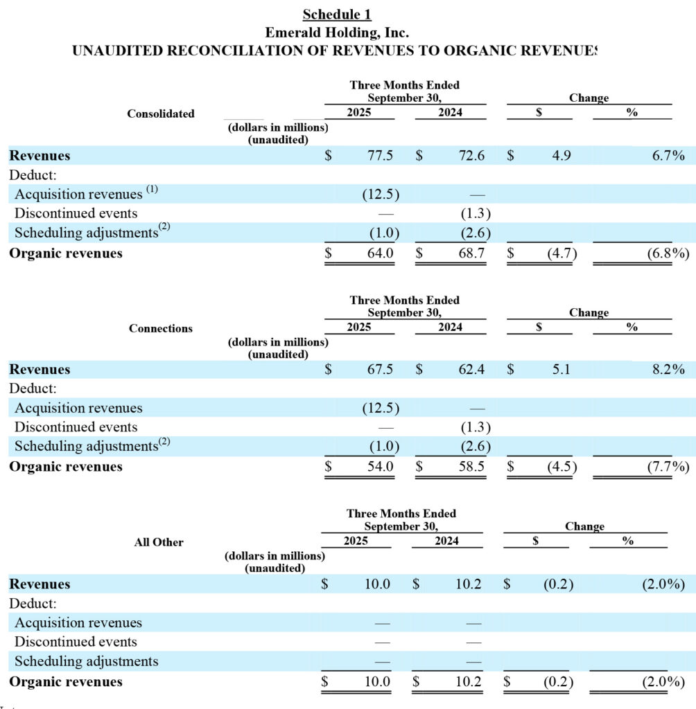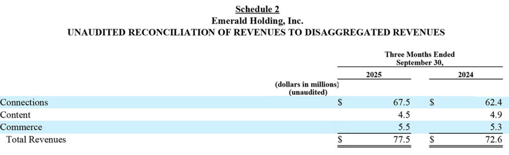 Emerald reported third-quarter consolidated revenues of $77.5 million for the 90-day period that ended on September 30, 2025. This was an increase of $4.9 million or 6.7% over revenues of $72.6 million in the same quarter in fiscal 2024. However, as you dig into Emerald’s report, you discover that this consolidated revenue number includes multiple new shows added in 2025 that weren’t in the 2024 numbers…in other words, a bit of an inaccurate or an apples-to-oranges comparison.