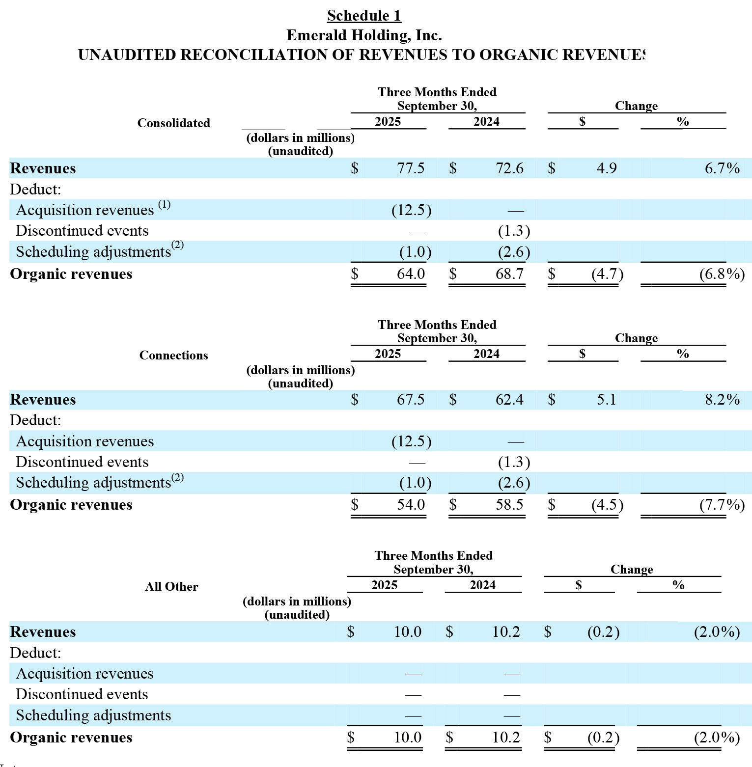 The three tables shown above reveal the true “organic” results for Emerald in the quarter. The top table is the total combined result (“Consolidated”) that sums the two independent business units (“Connections” and “All Other”). Remember, All Other includes both the Content and the Commerce segments combined.