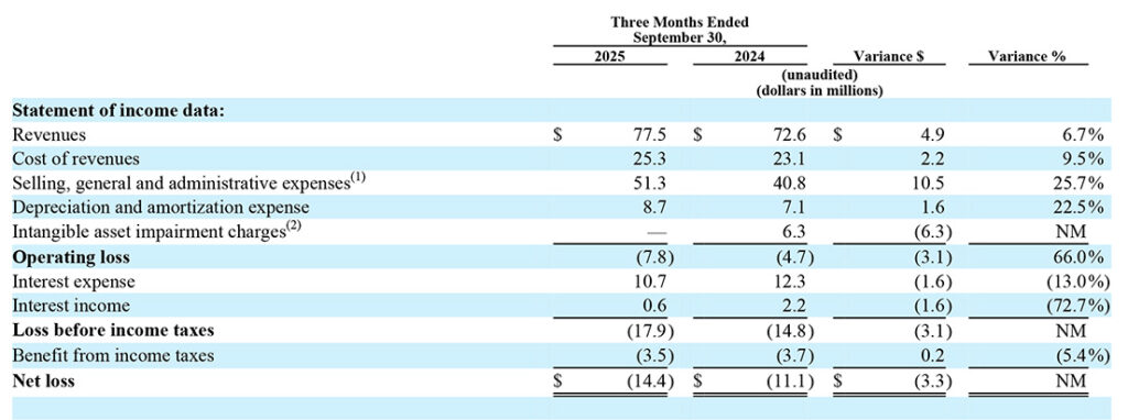 This table presents the Condensed Consolidated Statements of Loss. Revenues grew by $4.9 or 6.7% to $77.5 million. The company had an Operating loss of $7.8 million and a Net loss of $14.4 million [Click to enlarge]