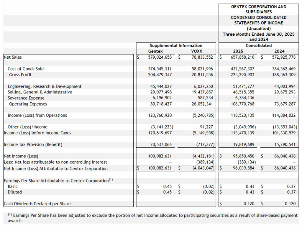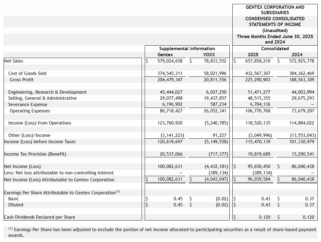 Total income from operations in the quarter this year came in at $118.5 million, up $3.6 million or 3.1% compared to income from operations of $114.9 million in the second quarter of 2024, which does not include VOXX. Core Gentex income from operations (excluding VOXX) came in at $123.8 million, an 8% increase over the same quarter last year. Once again, the profit picture looks better when VOXX is not included.