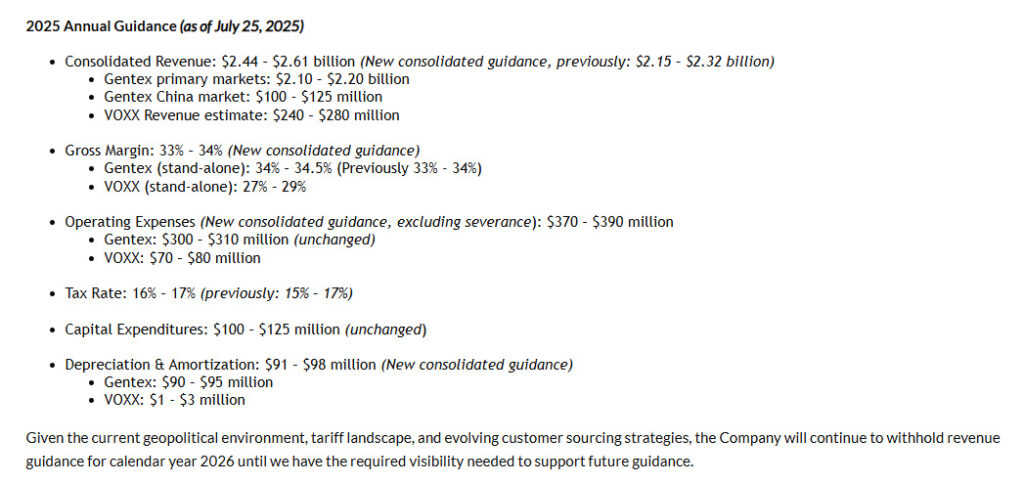 Gentex Corporation (Nasdaq: GNTX) has reported its financial results for the second quarter of Fiscal 2025, the 90-day period that ended on June 30, 2025. For the most part, results looked better than initially expected, although much of the upside improvement in revenues was largely thanks to the acquisition of VOXX Int’l, the company that owns audio brands Onkyo, Integra, and Klipsch as well as other automotive electronics brands. That acquisition closed on April 1, the first day of the second quarter.