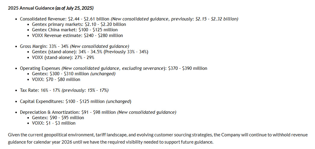 So we have to acknowledge the 800-pound gorilla in the room. Gentex’s acquisition of VOXX literally closed on April 1, 2025. Then, on April 2, 2025, the Trump administration announced what it called “Liberation Day,” launching a massive global tariff program that ultimately at one point reached 145% assessment increase (for imports from China)…throwing the business world into turmoil. Looked at through that lens, Gentex has much to be pleased with in this report.