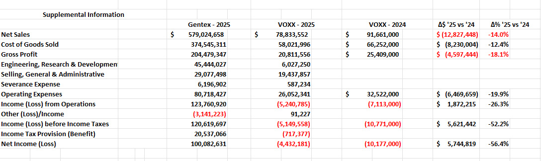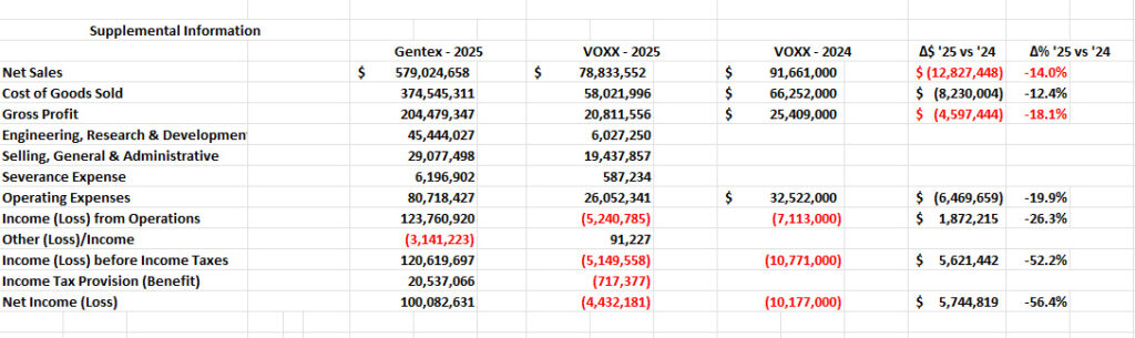 If you’ll refer to my spreadsheet above you’ll see a total of six columns of data: reading from L-R, the first is the data item (i.e. Net Sales), the second column is Gentex ‘Core’ results, the third column is VOXX’s Core results under Gentex management, the fourth column is VOXX’s results as an independent company in the comparable quarter a year ago, the fifth column is the delta (difference) in dollars between VOXX’s 2024 & 2025 results, and the sixth column is the delta in percent.