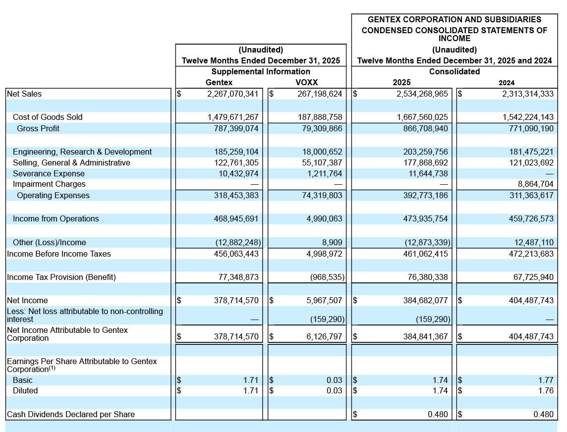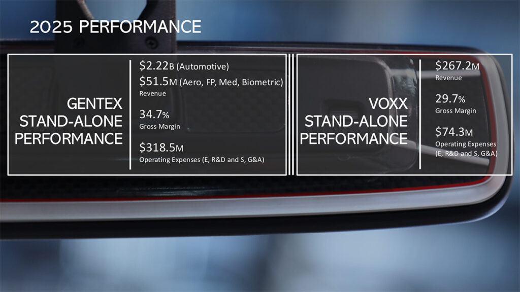 Gentex Automotive – For calendar 2025, Gentex Automotive net sales were $2.22 billion, down $40 million or 2% compared to automotive net sales of $2.26 billion in calendar 2024. The company noted that its shipments of auto-dimming mirrors, its key product, were down 6%.