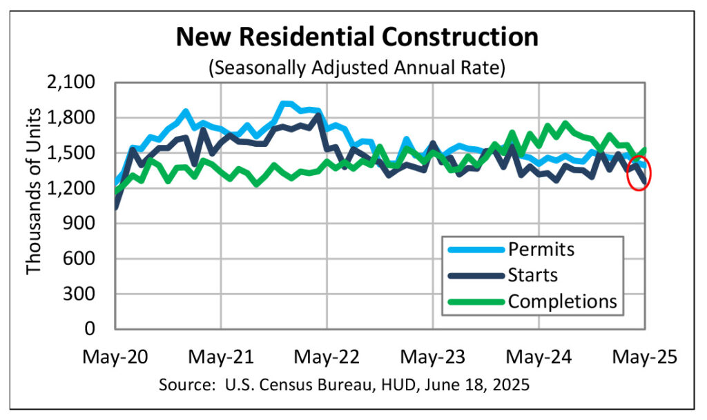 Surprising news on Wednesday as we learn that the latest residential construction data from the U.S. Census Bureau and the U.S. Department of Housing and Urban Development show that overall housing starts in May dropped a substantial 9.8% compared to the reading in April, and ranks below May 2024 starts by 4.6%. This is the slowest pace in housing starts in the last five years.