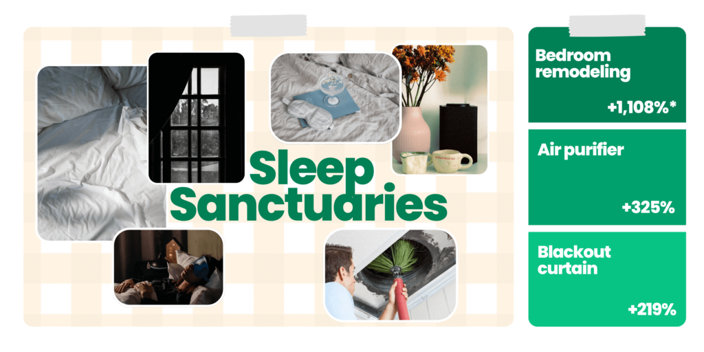 - Sleep sanctuaries – Improving bedrooms for better sleep with, for example, soundproofing services (+137%), blackout curtains (+219%), and air purifiers (+325%). Bedroom remodeling projects “have skyrocketed 1,108% in the past year.” Yelp says.