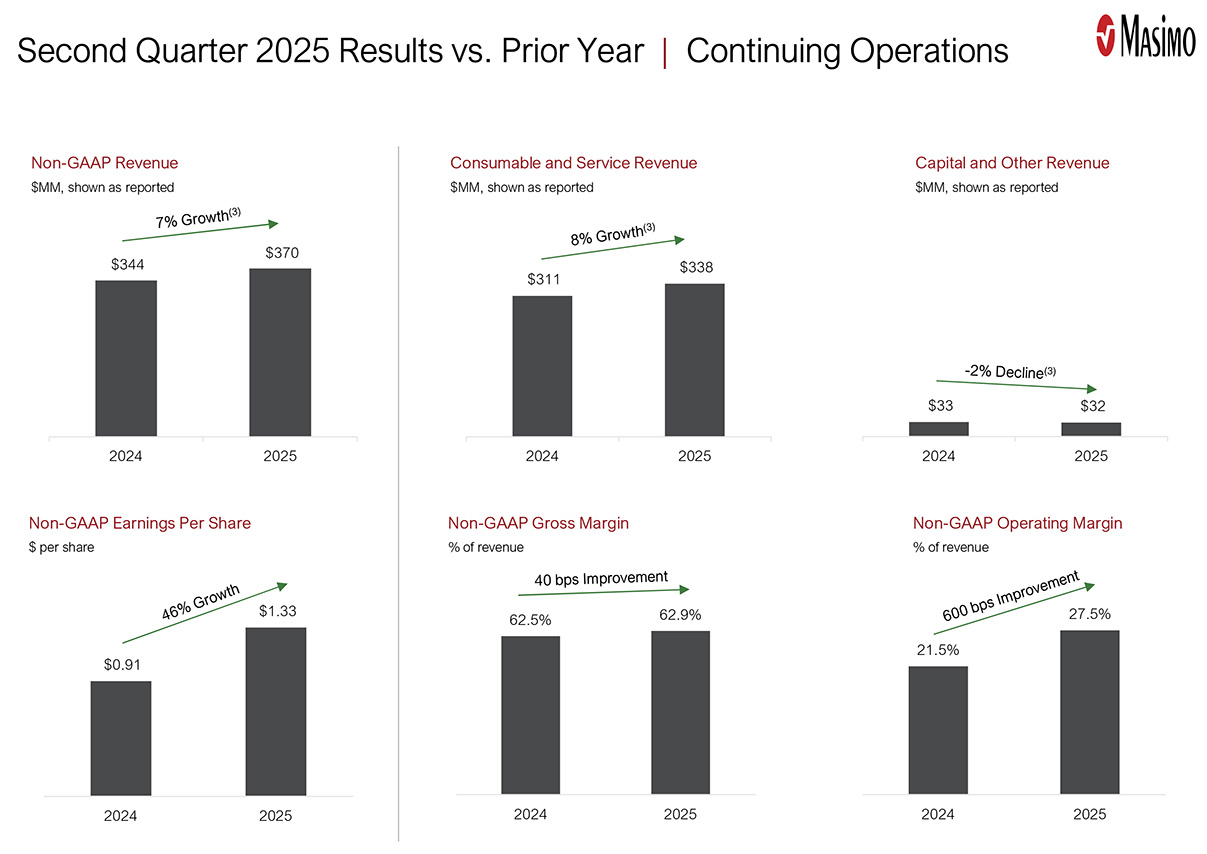 After markets closed on Tuesday, Masimo Corporation [Nasdaq: MASI] released its results for the second quarter of Fiscal Year 2025, and to my eyes, they looked really solid. Revenues grew by a respectable 8%, operating profits grew by 54%(!), operating margins improved by 520 basis points (that’s 5.2% more than last year), and earnings per share shot up an eye-popping 78%(!) What’s not to like?
