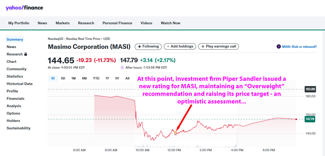Perhaps fueling that partial recovery, in the early afternoon, investment firm Piper Sandler issued a new rating for MASI in which it maintained an overweight recommendation and increased its target price from $200 to $210 – an optimistic assessment. On Yahoo Finance, we find that of the eight investment firms following Masimo: two rate MASI a “Hold,” four rate it a “Buy,” and two rate it a “Strong Buy.”