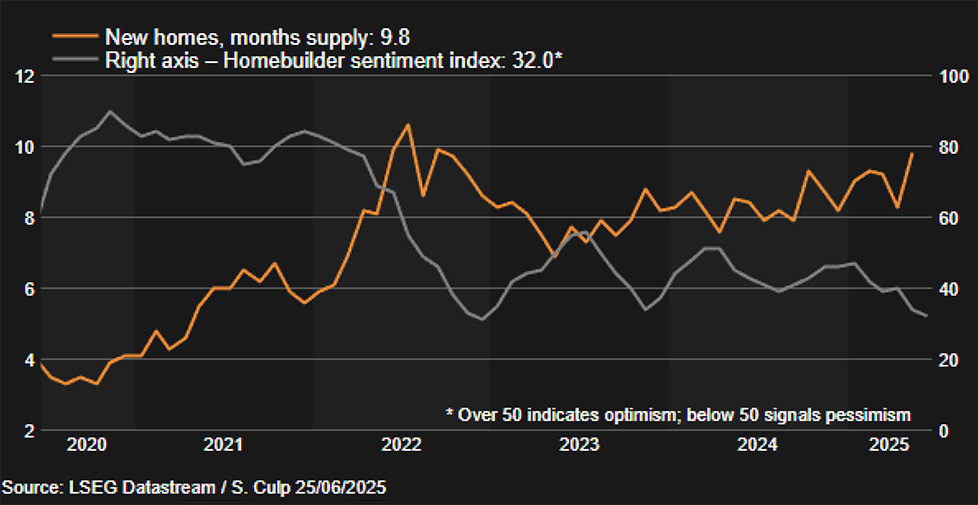 In the meantime, this sales slowdown means that the available inventory of new homes for sale increased. According to the report, there are now 507,000 unsold new homes available, the highest level of inventory since October 2007. This inventory level increased by 7,000 homes in May, 15% higher than it was in May 2024. At current sales rates, that equates to a 9.8-month supply of new homes available for purchase.