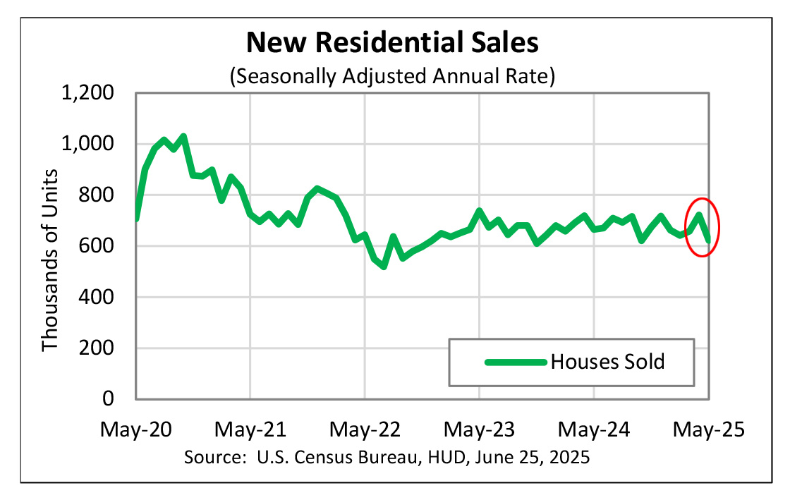 Sales of new single-family houses in May came in at a seasonally-adjusted annual rate of 623,000 units according to the government’s latest data. This rate is fully 13.7% below the rate of 722,000 in April and 6.3% below new home sales of 665,000 in May of 2024.