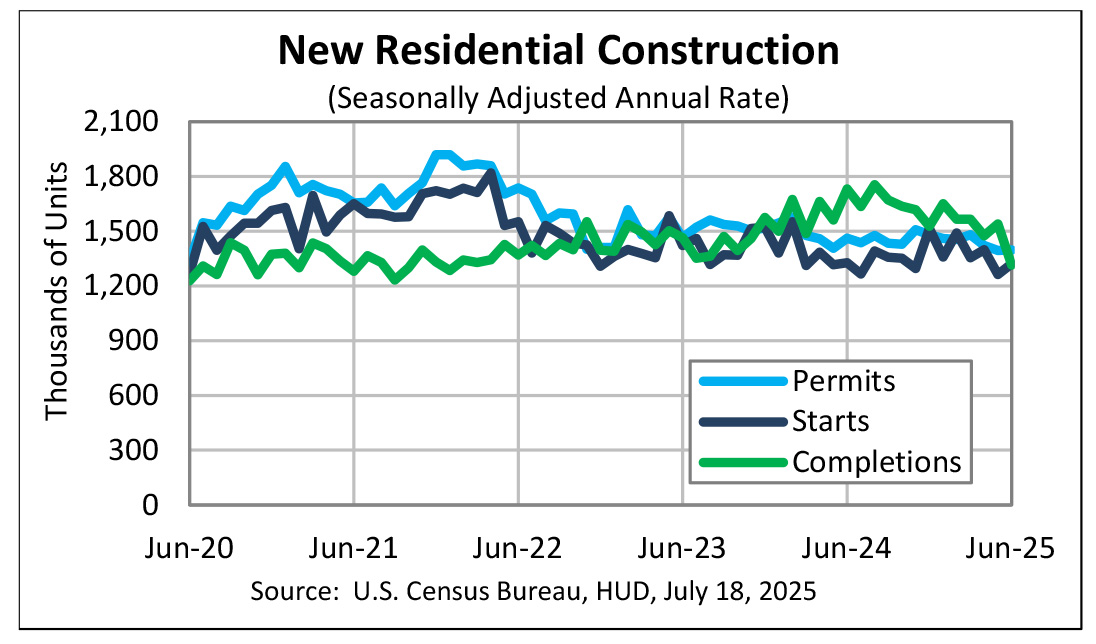 It’s a bit of a mixed bag in new residential construction data published today, generally known as housing starts. In June, the seasonally adjusted annual rate (SAAR) of the start of new home construction jumped 4.6% over the revised May rate. However, this rate remains 0.5% lower than the rate of construction starts in June of 2024, one year ago.