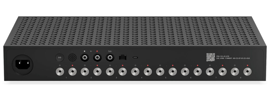 Amp Multi is a class D amplifier with 8 channels of 125 watts of power (8Ω, all channels driven), driving four zones. The amplifier utilizes Gallium Nitride (GaN) technology with post-filter feedback (PFFB). Each channel can drive up to three “Sonos Architectural speakers” for a total of 24 speakers across the 8 channels.