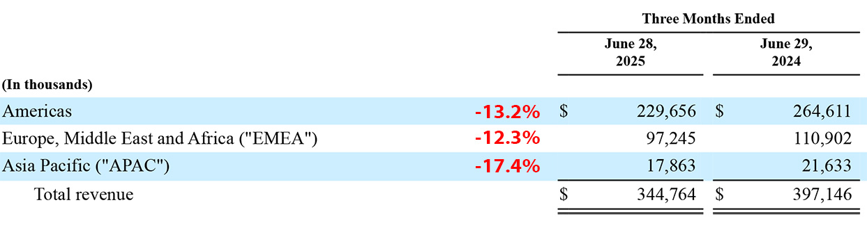 Much like the product category analysis above, revenues by Geographic Region also declined in all regions. Sonos tracks revenues by three main geographic areas: The Americas (North & South America), EMEA (Europe, Middle East, Africa), and APAC (Asia-Pacific).