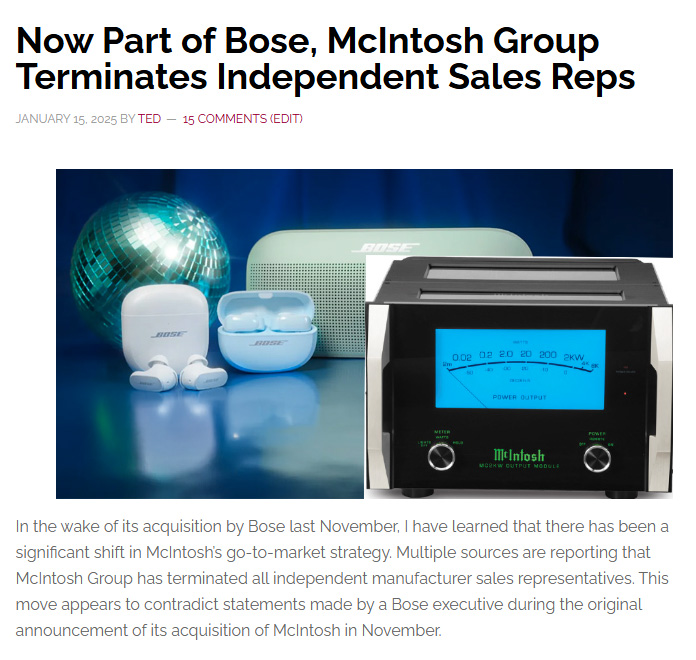 Published January 15, 2025… This story was a follow-up to my story in November 2024 on Bose acquiring McIntosh. At the time of the acquisition, Bose officials said there would be no downsizing of the workforce as a result of this transaction. Then, in January, I learned that the company had quietly terminated all of the McIntosh independent specialty representatives.