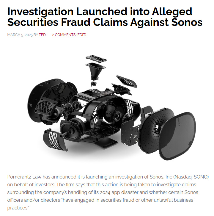 Published March 5, 2025… In this story, I learned of an investigation of Sonos being launched to determine if the company engaged in any securities fraud related to its communications with investors over its app disaster. I see announcements of this type all the time, as the U.S. has a very active plaintiffs’ bar. But this company, the Pomerantz LLP, has a pretty solid reputation.