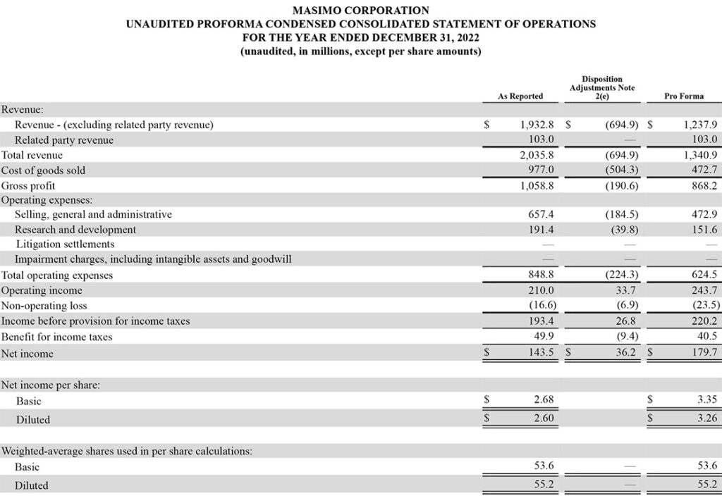 The year 2022 was the year that Masimo acquired Sound United, so only part of the year was impacted. In any event, we see that Total revenue dropped from the reported $2.036 billion to the Pro Forma total revenue of $1.341 billion. Gross profit was originally a reported $1.059 billion, which dropped to $868 million Pro Forma. Operating income went from $210 million as reported to $244 million Pro Forma. Finally, Net income went from a reported $144 million to a Pro Forma $180 million.