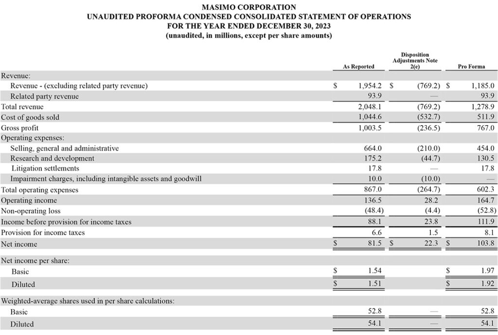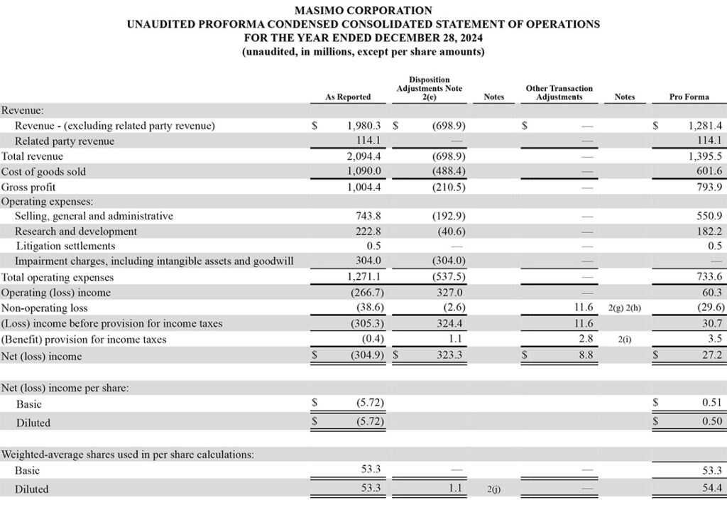 Said the filing: “The following unaudited pro forma condensed consolidated financial information is intended to illustrate how the above transactions would affect the historical financial statements of Masimo if the Transaction had been consummated at an earlier time as indicated herein.”